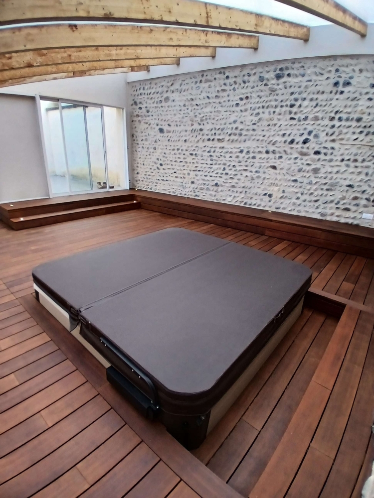 Instinct Naturel a conçu et installé cette superbe terrasse en bois pour un espace bien-être intérieur. L’intégration soignée d’un spa encastré met en valeur le design chaleureux et élégant du bois. La structure en lames de bois de haute qualité s’harmonise parfaitement avec les éléments naturels environnants, notamment le mur en pierre apparente et la charpente en bois du plafond.